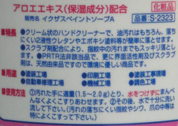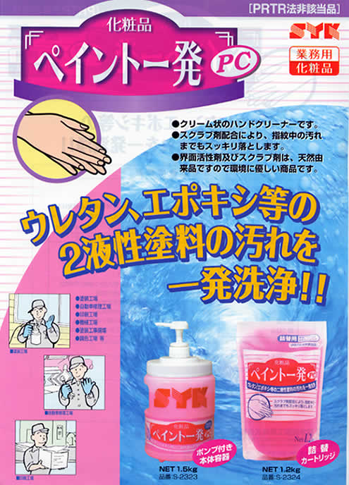 ペイント一発と洗浄力は同等で、手肌にはより優しい「化粧品」指定を受けた商品です。 <特長> ウレタン・エポキシなどの2液性塗料の汚れを強力に落とすクリーム状のハンドクリーナー。 スクラブ剤配合により指紋に付着した汚れまでもスッキリ落とします。 界面活性剤およびスクラブ剤は天然由来品なので環境にやさしい、PRTR法非該当品です。 <使用用途> 業務用手洗い洗剤、塗料落とし <使用方法> (1) 汚れた手に適量の(1.5~2.0g)を取り、水をつけずによくすり合わせる。 (2) その後、水で洗い流す。汚れの落ちにくい指紋やシワ、爪の中等は特に良く擦る。 ■ 内容量1.5kg(専用容器入) 付属品:ポンプ(1容器に1本セット) |