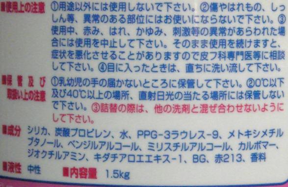 | 成分 | 天然ヤシ油脂肪酸系界面活性剤・エステル系溶剤・グリコールエーテル系溶剤・アルコール系溶剤・研磨剤・手荒れ防止剤・増粘剤・アロエエキス・中和剤・香料・染料・精製水 |