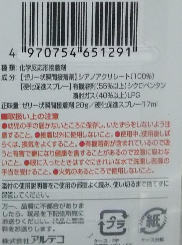 アルテコ製のアルテコ721は、ジェル状瞬間接着剤と硬化促進スプレーをセットにした商品です。