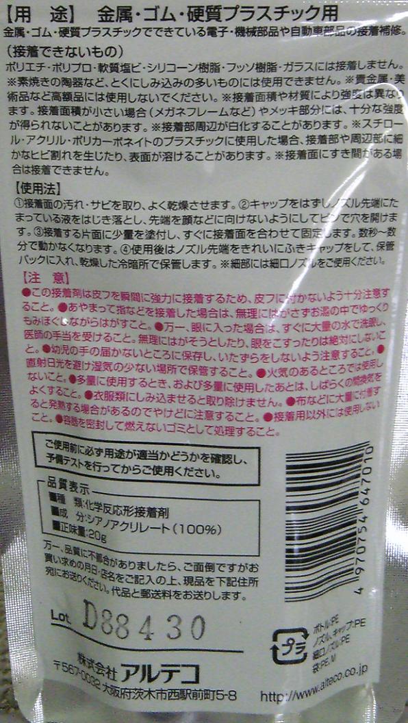 アアルテコ製のアルテコ 711は、金属・ゴム・硬質プラスチック用瞬間接着剤です。