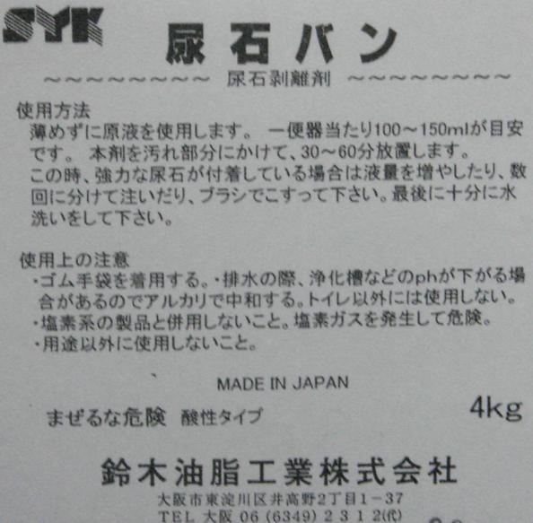 便器にたまっている水を事前にハンドポンプなどを使って取り除いておくとより効果的。 (2) 薄めずに原液を使用する。 (3) 便器に100~150ml使用。 (4) そのまま30~60分間放置する。硬い尿石、厚い尿石が付着したところには液量を 増やしたり数回に分けて注ぐ。 (5) 必要に応じてブラシで擦り、最後に十分水洗いする。 |