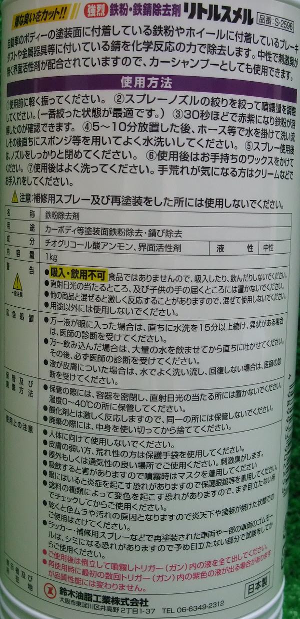 | <使用用途> 鉄粉クリーナー 鉄粉除去剤 <使用方法> 水をかけて、ボディーを冷やす。 噴霧する 鉄粉と反応して赤紫になる。 再度水をかけ軽く洗い流す。 スポンジで拭いて水アカも除去。水で洗い流して仕上げる。 ■ 内容量20kg |