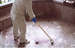 リトルスメルを噴霧又は塗布する。数分間放置した後デッキブラシなどでこする。 ![]() |