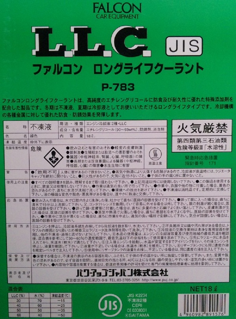 【用途・種類】:液冷式内燃機関用冷却液・LLC (95%)