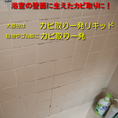 2:カビ取り一発リキッドをスポンジに取り、お風呂のカベ等、カビがある場所に塗り広げてゆきます。